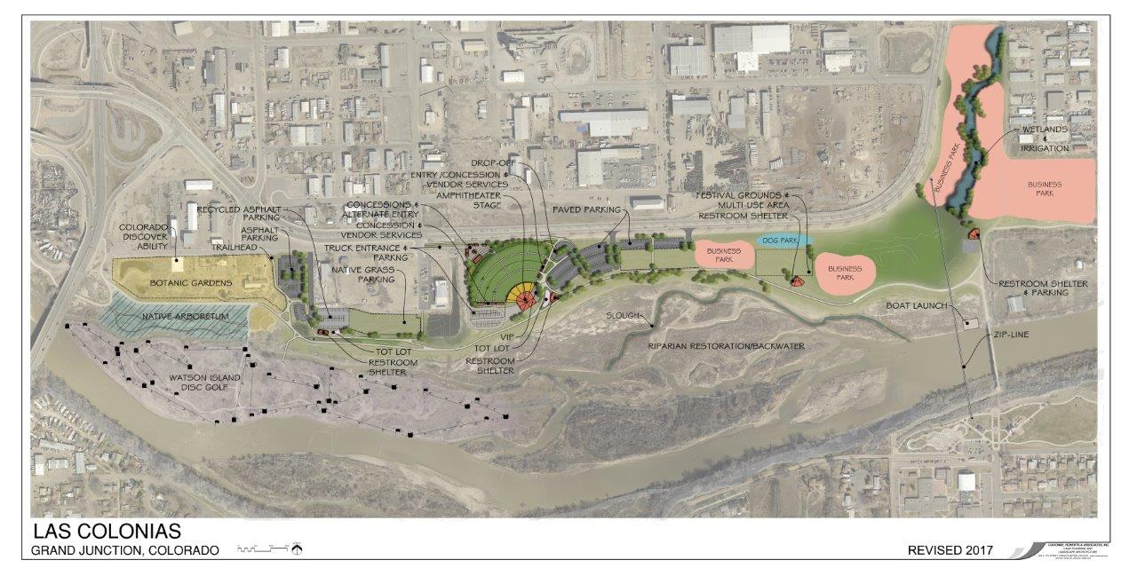 Las Colonias Park is 130 acres and sits adjacent to downtown Grand Junction along the banks of the Colorado River. It has a diverse and rich history, as it is situated just upstream from the namesake of the community, the confluence of the Gunnison and Colorado Rivers, and has strong connections to the rest of the community along an existing and expanding Riverfront Trail system. Several new facility elements have been completed including the River Park, restrooms, shelters, and concessions.