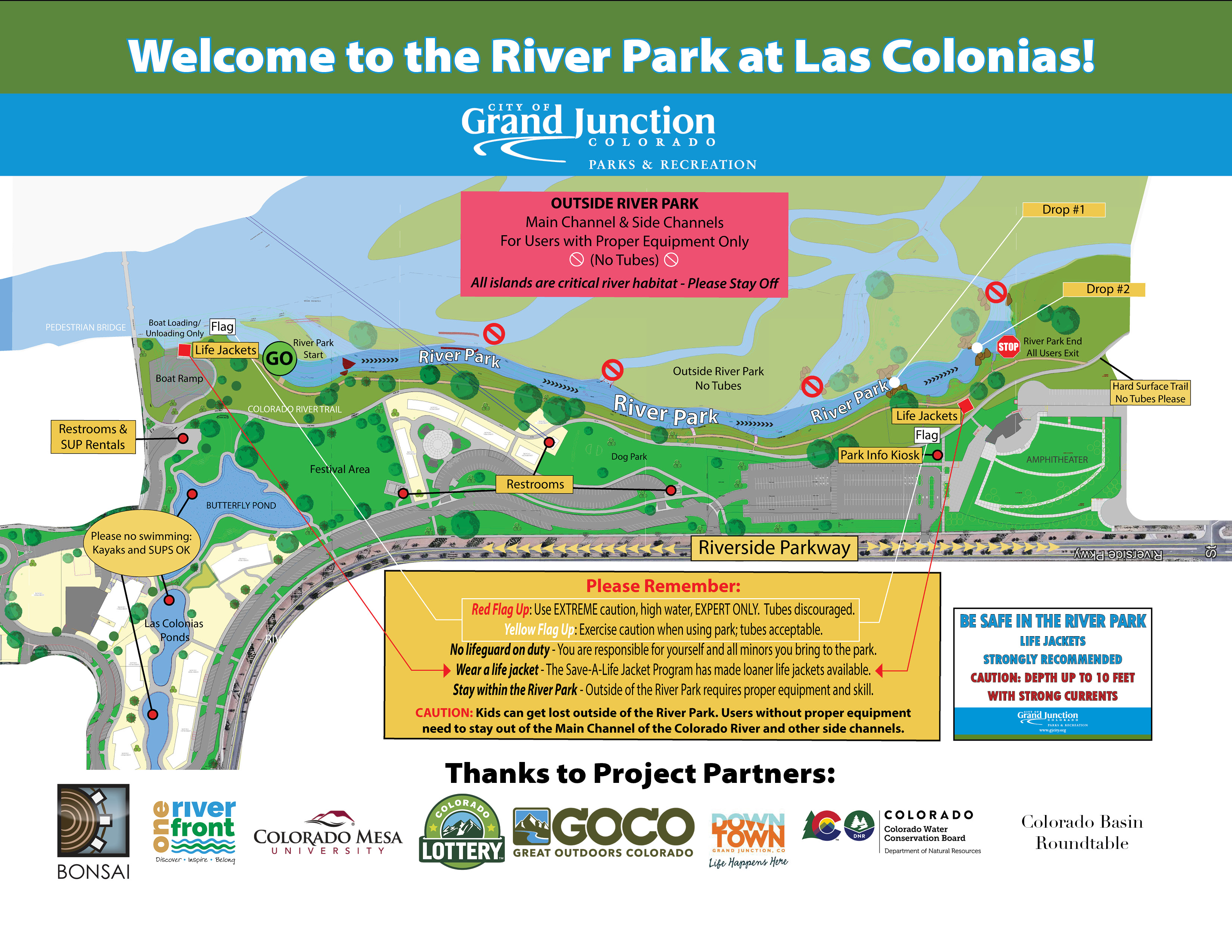 The community raised $2.1 million locally to match a $1.6 million grant from the Department of Local Affairs. Local fundraising support is thanks to the Downtown Development Authority, Riverfront Foundation, Goodwin Foundation, Bacon Family Foundation, Grand Junction Lions Club, El Pomar Foundation, Gates Family Foundation, Department of Energy, Navarro, and the City of Grand Junction.